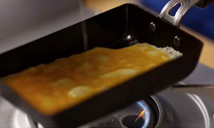 卵液を全体に流し広げ、底面が固まったら、濡れ布巾の上で裏返します。