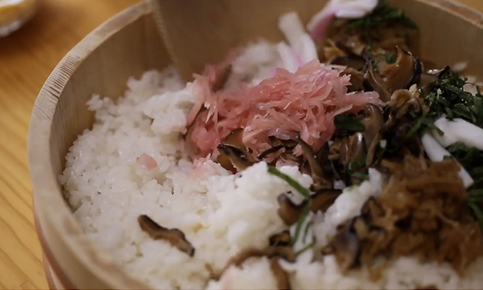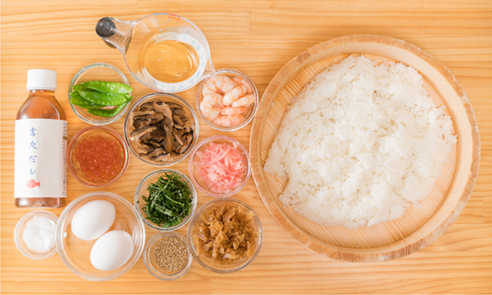 炊きたてのご飯に寿司酢と「吉次だし」を入れよく合わせます。