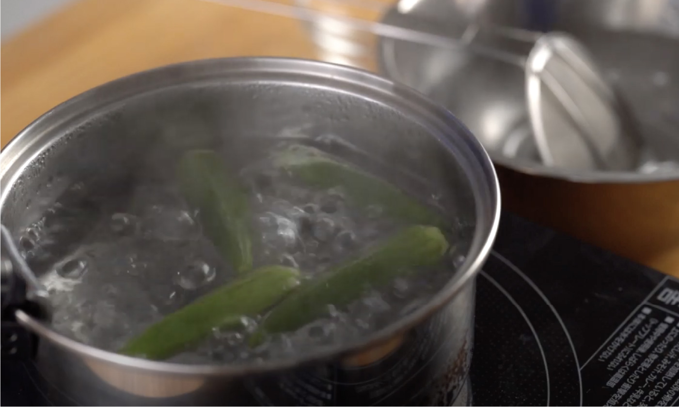 オクラをさっと茹で、ざる上げして氷水に入れて冷まします。